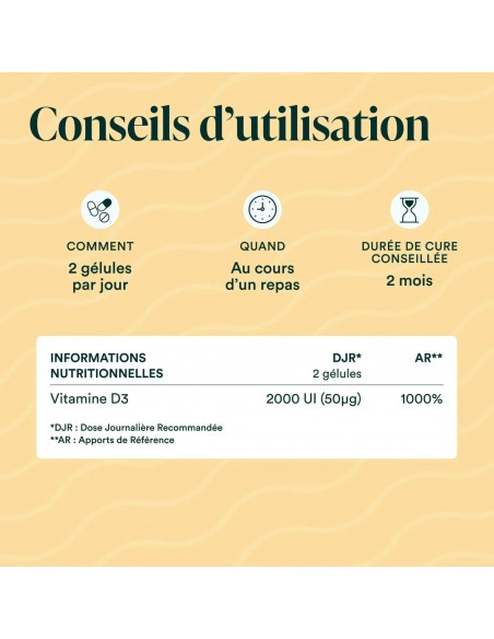 Notre complément de vitamine D3 est fabriqué en France. Ce produit est garanti sans OGM, sans gluten, sans additifs et sans excipients, et convient aux régimes végétariens et végans.